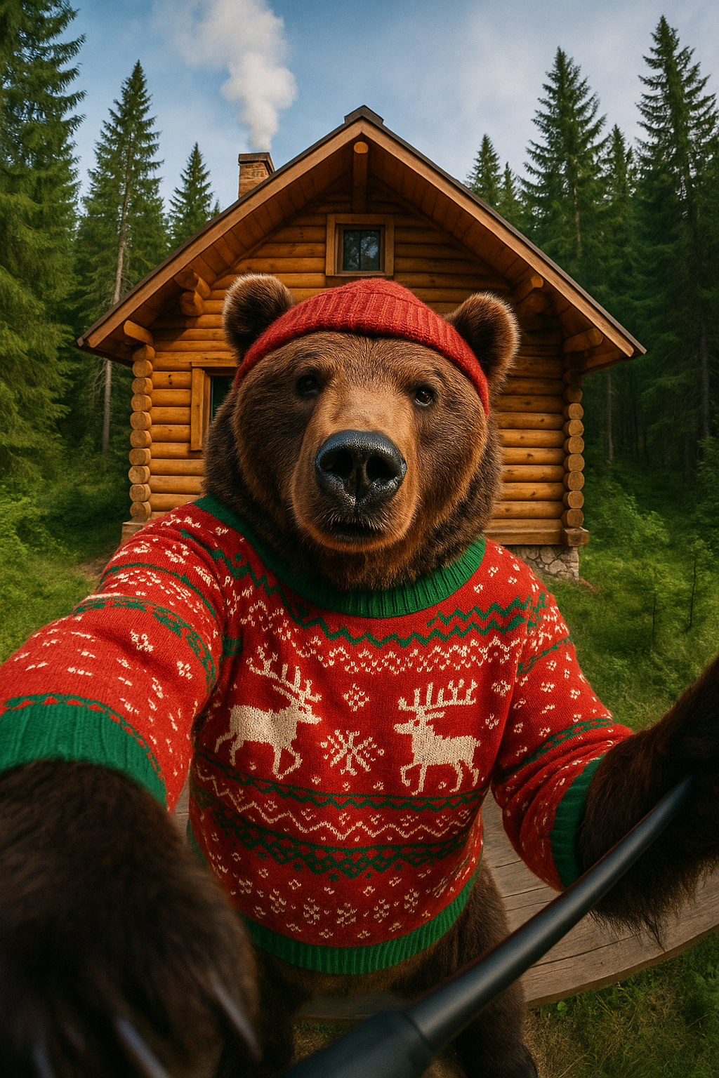 Un realistico orso bruno si trova sulla soglia di una casa di legno, circondata da una foresta di pini, indossa una vivace maglione natalizio e un berretto. Sta girando un video selfie. La telecamera imita l’obiettivo grandangolare di una GoPro, con movimenti dinamici quando l’orso gira il bastone per selfie. Si vede la casa alle sue spalle, il fumo che esce dal camino e la foresta verde tutt’intorno.